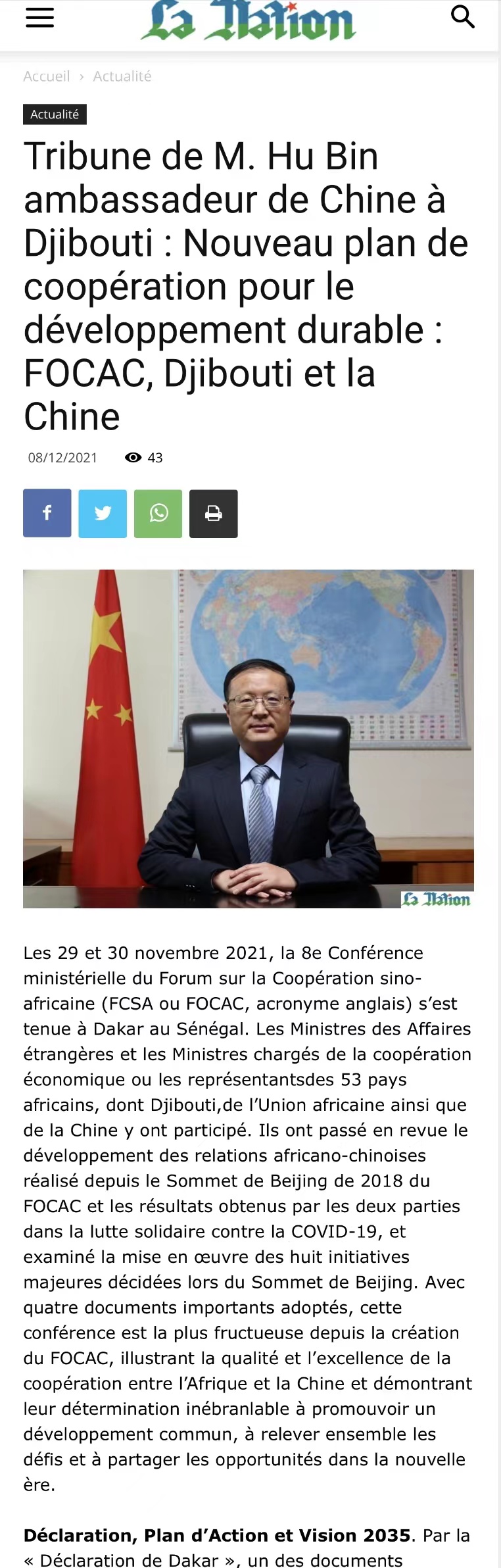 2021年12月8日,驻吉布提大使胡斌在吉布提主要官方报纸《民族报》发表题为《新的可持续发展合作蓝图》的署名文章,介绍中非合作论坛第八届部长级会议成果,展望中吉合作广阔前景,全文如下: