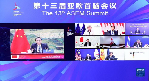 李克强表示,亚欧会议是亚欧之间规模最大的政府间论坛,53个成员人口占世界总人口近六成,经济总量占世界一半,贸易总量接近全球七成,在国际政治经济版图上有着重要影响。习近平主席提出,要在亚欧大陆架起一座友谊与合作之桥。当前亚欧国家共同面临应对疫情挑战和推动经济复苏的重要议题,既要有战胜困难的信心和勇气,也要坚持团结合作这一正确的途径和办法。要坚持自由贸易,保持全球产业链供应链稳定畅通。区域全面经济伙伴关系协定(RCEP)明年如期生效实施,将为地区经济复苏提供新的动力。