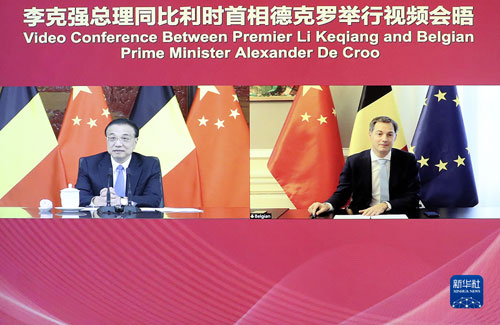 2021年12月7日下午,国务院总理李克强在中南海紫光阁同比利时首相德克罗举行视频会晤。