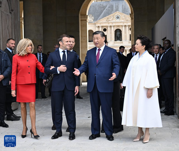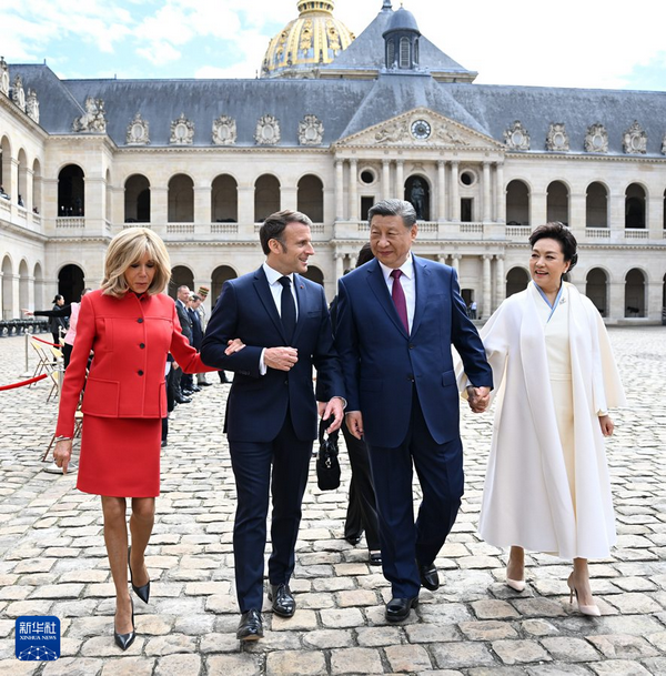 五月的巴黎,风和景明。塞纳河畔,荣军院金色穹顶熠熠生辉,五星红旗和蓝白红三色旗迎风飘扬。