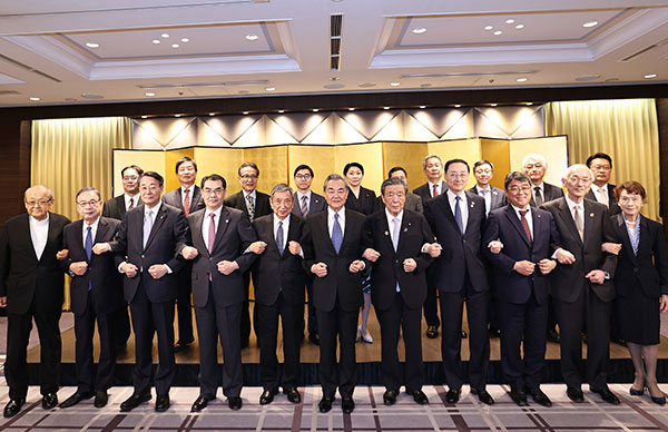 王毅表示,日中友好七团体长期致力于中日友好,为中日关系改善发展作出独特和重要贡献,中方高度赞赏。当前两国关系既迎来改善发展的重要机遇,也需要应对各种挑战和问题。希望七团体坚定信心,排除干扰,克服困难,勇往直前,坚持中日和平友好合作的大方向,为维护两国人民根本利益作出新的贡献。一要维护好两国关系的政治基础。中日联合声明经中日和平友好条约确认,共同构成具有法律约束力的两国关系指导性文件,必须严格履行,尤其要正确看待处理历史和台湾问题,抵制一切歪曲篡改、动摇模糊的言行。二要发扬“以民促官”传统。大力加强各领域对话交流,增进两国人民理解互信。三要培养中日友好的接班人。团结更多各界人士,特别是鼓励青年一代广泛参与两国友好事业,把中日世代友好传承下去,发扬光大。